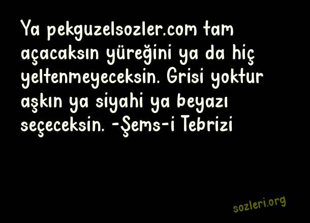 Ya tam açacaksın yüreğini ya da hiç yeltenmeyeceksin. Grisi yoktur aşkın ya siyahi ya beyazı seçeceksin. -Şems-i Tebrizi ( Aşk İlanı )