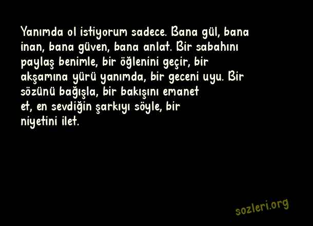 Yanımda ol istiyorum sadece. Bana gül, bana inan, bana güven, bana anlat. Bir sabahını paylaş benimle, bir öğlenini geçir, bir akşamına yürü yanımda, bir geceni uyu. Bir sözünü bağışla, bir bakışını emanet et, en sevdiğin şarkıyı söyle, bir niyetini ilet. ( Yanında Olmak )