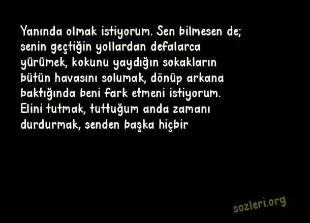 Yanında olmak istiyorum. Sen bilmesen de; senin geçtiğin yollardan defalarca yürümek, kokunu yaydığın sokakların bütün havasını solumak, dönüp arkana baktığında beni fark etmeni istiyorum. Elini tutmak, tuttuğum anda zamanı durdurmak, senden başka hiçbir ( Yanında Olmak )