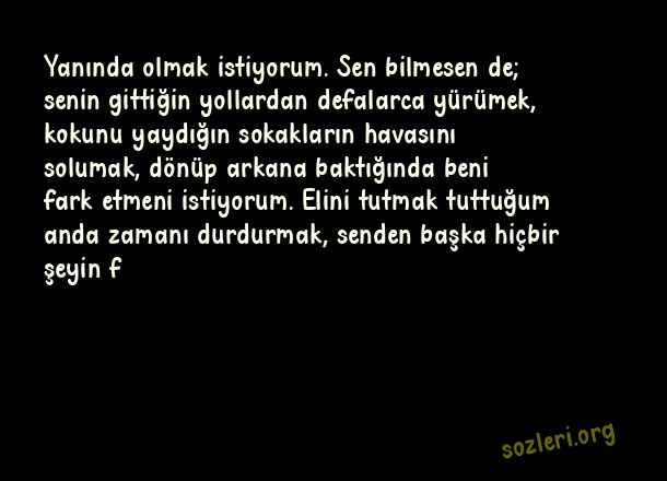 Yanında olmak istiyorum. Sen bilmesen de; senin gittiğin yollardan defalarca yürümek, kokunu yaydığın sokakların havasını solumak, dönüp arkana baktığında beni fark etmeni istiyorum. Elini tutmak tuttuğum anda zamanı durdurmak, senden başka hiçbir şeyin f ( Yanında Olmak )
