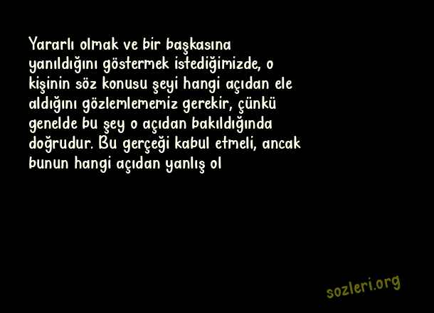 Yararlı olmak ve bir başkasına yanıldığını göstermek istediğimizde, o kişinin söz konusu şeyi hangi açıdan ele aldığını gözlemlememiz gerekir, çünkü genelde bu şey o açıdan bakıldığında doğrudur. Bu gerçeği kabul etmeli, ancak bunun hangi açıdan yanlış ol ( Yanılmak )