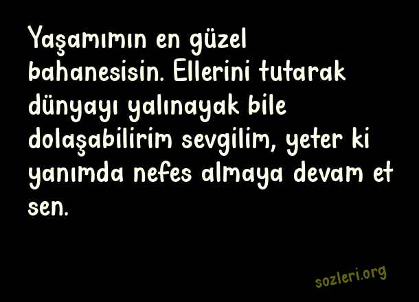 Yaşamımın en güzel bahanesisin. Ellerini tutarak dünyayı yalınayak bile dolaşabilirim sevgilim, yeter ki yanımda nefes almaya devam et sen. ( Dünyanın En Romantik )