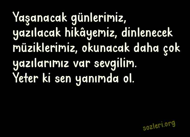 Yaşanacak günlerimiz, yazılacak hikâyemiz, dinlenecek müziklerimiz, okunacak daha çok yazılarımız var sevgilim. Yeter ki sen yanımda ol. ( Dünyanın En Romantik )