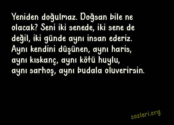 Yeniden doğulmaz. Doğsan bile ne olacak? Seni iki senede, iki sene de değil, iki günde aynı insan ederiz. Aynı kendini düşünen, aynı haris, aynı kıskanç, aynı kötü huylu, aynı sarhoş, aynı budala oluverirsin. ( Sait Faik Abasıyanık )