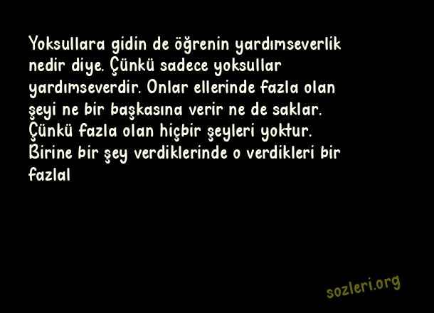 Yoksullara gidin de öğrenin yardımseverlik nedir diye. Çünkü sadece yoksullar yardımseverdir. Onlar ellerinde fazla olan şeyi ne bir başkasına verir ne de saklar. Çünkü fazla olan hiçbir şeyleri yoktur. Birine bir şey verdiklerinde o verdikleri bir fazlal ( Dayanışma )