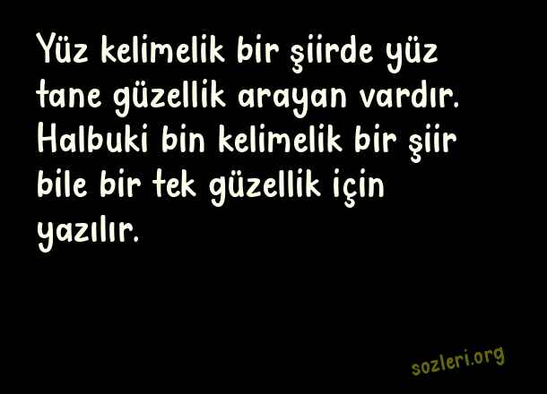 Yüz kelimelik bir şiirde yüz tane güzellik arayan vardır. Halbuki bin kelimelik bir şiir bile bir tek güzellik için yazılır. ( Orhan Veli Kanık )