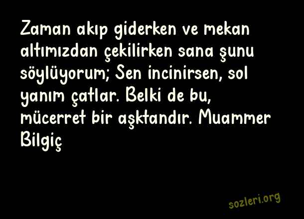 Zaman akıp giderken ve mekan altımızdan çekilirken sana şunu söylüyorum; Sen incinirsen, sol yanım çatlar. Belki de bu, mücerret bir aşktandır. Muammer Bilgiç ( Sol Yanım )