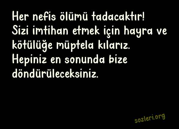 Her nefis ölümü tadacaktır! Sizi imtihan etmek için hayra ve kötülüğe müptela kılarız. Hepiniz en sonunda bize döndürüleceksiniz. ( Anlamlı Güzel Dini Sözler )