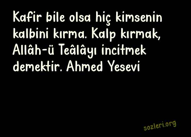 Kafir bile olsa hiç kimsenin kalbini kırma. Kalp kırmak, Allâh-ü Teâlâyı incitmek demektir. Ahmed Yesevi ( Anlamlı Güzel Dini Sözler )