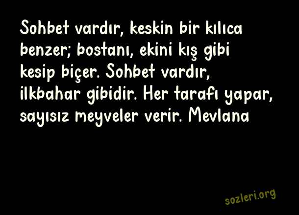 Sohbet vardır, keskin bir kılıca benzer; bostanı, ekini kış gibi kesip biçer. Sohbet vardır, ilkbahar gibidir. Her tarafı yapar, sayısız meyveler verir. Mevlana ( Anlamlı Güzel Dini Sözler )
