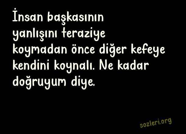 İnsan başkasının yanlışını teraziye koymadan önce diğer kefeye kendini koynalı. Ne kadar doğruyum diye. ( Anlamlı Sözler 2023 )