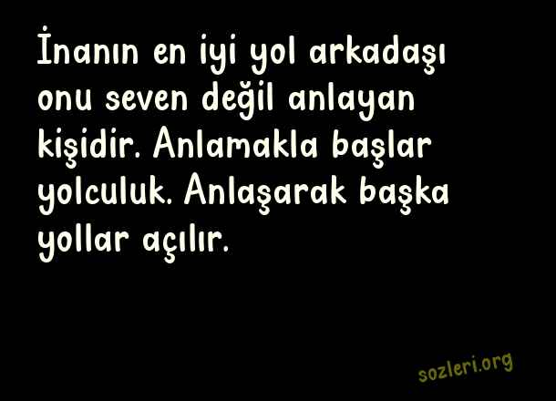 İnanın en iyi yol arkadaşı onu seven değil anlayan kişidir. Anlamakla başlar yolculuk. Anlaşarak başka yollar açılır. ( Anlaşmak )