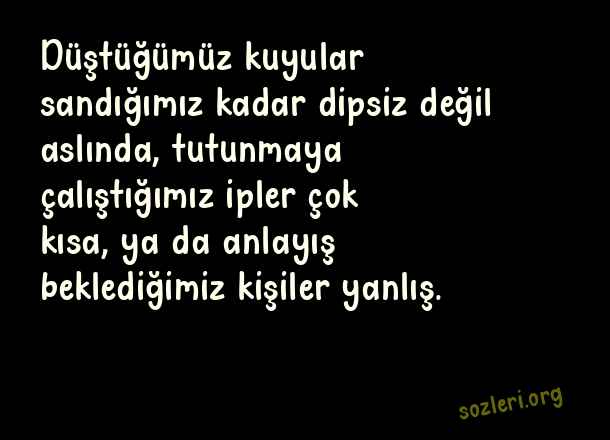 Düştüğümüz kuyular sandığımız kadar dipsiz değil aslında, tutunmaya çalıştığımız ipler çok kısa, ya da anlayış beklediğimiz kişiler yanlış. ( Anlayışsız İnsanlara Sözler )