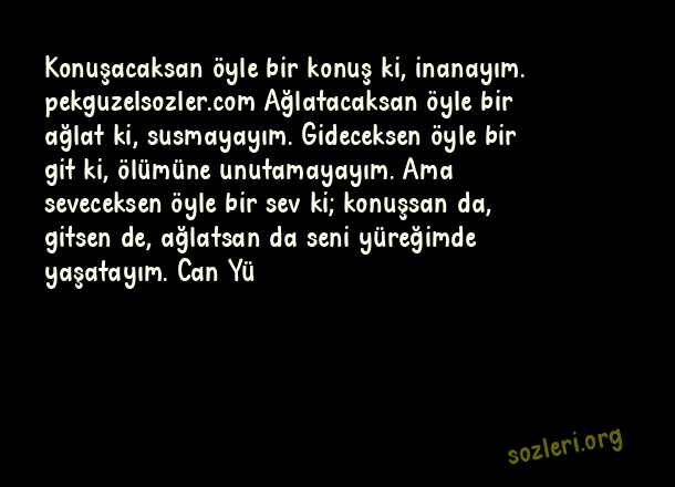 Konuşacaksan öyle bir konuş ki, inanayım. Ağlatacaksan öyle bir ağlat ki, susmayayım. Gideceksen öyle bir git ki, ölümüne unutamayayım. Ama seveceksen öyle bir sev ki; konuşsan da, gitsen de, ağlatsan da seni yüreğimde yaşatayım. Can Yü ( Anlayışsız İnsanlara Sözler )