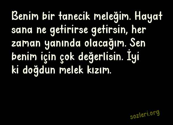 Benim bir tanecik meleğim. Hayat sana ne getirirse getirsin, her zaman yanında olacağım. Sen benim için çok değerlisin. İyi ki doğdun melek kızım. ( Anneden Kızına Doğum Günü )