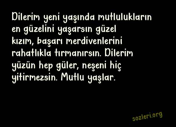 Dilerim yeni yaşında mutlulukların en güzelini yaşarsın güzel kızım, başarı merdivenlerini rahatlıkla tırmanırsın. Dilerim yüzün hep güler, neşeni hiç yitirmezsin. Mutlu yaşlar. ( Anneden Kızına Doğum Günü )