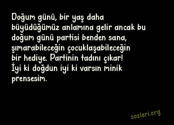 Doğum günü, bir yaş daha büyüdüğümüz anlamına gelir ancak bu doğum günü partisi benden sana, şımarabileceğin çocuklaşabileceğin bir hediye. Partinin tadını çıkar! İyi ki doğdun iyi ki varsın minik prensesim. ( Anneden Kızına Doğum Günü )