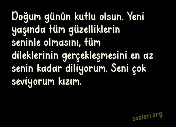 Doğum günün kutlu olsun. Yeni yaşında tüm güzelliklerin seninle olmasını, tüm dileklerinin gerçekleşmesini en az senin kadar diliyorum. Seni çok seviyorum kızım. ( Anneden Kızına Doğum Günü )
