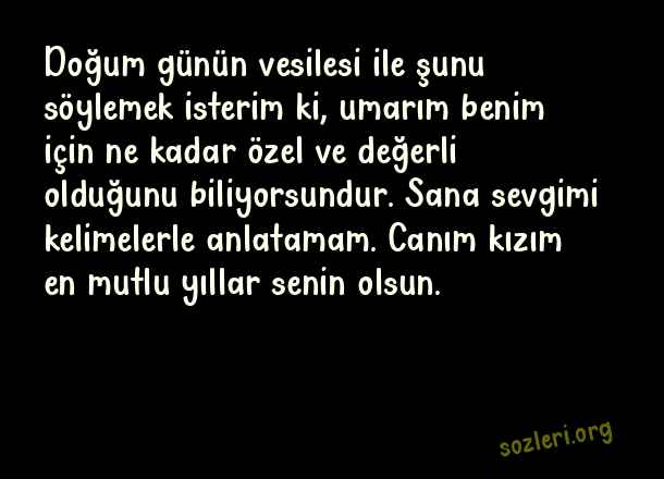 Doğum günün vesilesi ile şunu söylemek isterim ki, umarım benim için ne kadar özel ve değerli olduğunu biliyorsundur. Sana sevgimi kelimelerle anlatamam. Canım kızım en mutlu yıllar senin olsun. ( Anneden Kızına Doğum Günü )