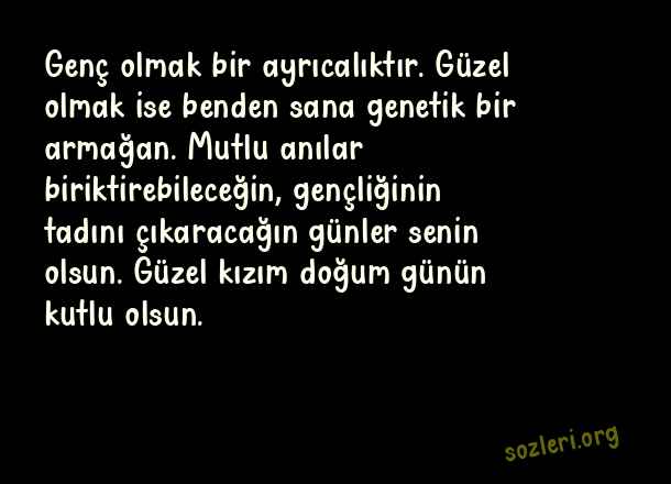 Genç olmak bir ayrıcalıktır. Güzel olmak ise benden sana genetik bir armağan. Mutlu anılar biriktirebileceğin, gençliğinin tadını çıkaracağın günler senin olsun. Güzel kızım doğum günün kutlu olsun. ( Anneden Kızına Doğum Günü )