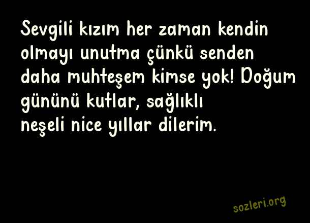 Sevgili kızım her zaman kendin olmayı unutma çünkü senden daha muhteşem kimse yok! Doğum gününü kutlar, sağlıklı neşeli nice yıllar dilerim. ( Anneden Kızına Doğum Günü )