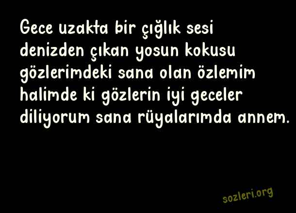 Gece uzakta bir çığlık sesi denizden çıkan yosun kokusu gözlerimdeki sana olan özlemim halimde ki gözlerin iyi geceler diliyorum sana rüyalarımda annem. ( Anneye İyi Geceler )