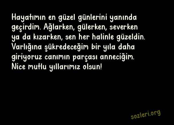 Hayatımın en güzel günlerini yanında geçirdim. Ağlarken, gülerken, severken ya da kızarken, sen her halinle güzeldin. Varlığına şükredeceğim bir yıla daha giriyoruz canımın parçası anneciğim. Nice mutlu yıllarımız olsun! ( Anneye Yeni Yıl )