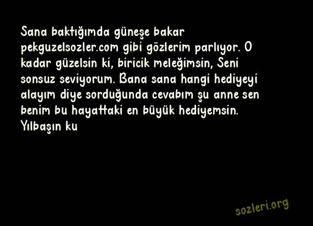 Sana baktığımda güneşe bakar gibi gözlerim parlıyor. O kadar güzelsin ki, biricik meleğimsin, Seni sonsuz seviyorum. Bana sana hangi hediyeyi alayım diye sorduğunda cevabım şu anne sen benim bu hayattaki en büyük hediyemsin. Yılbaşın ku ( Anneye Yeni Yıl )