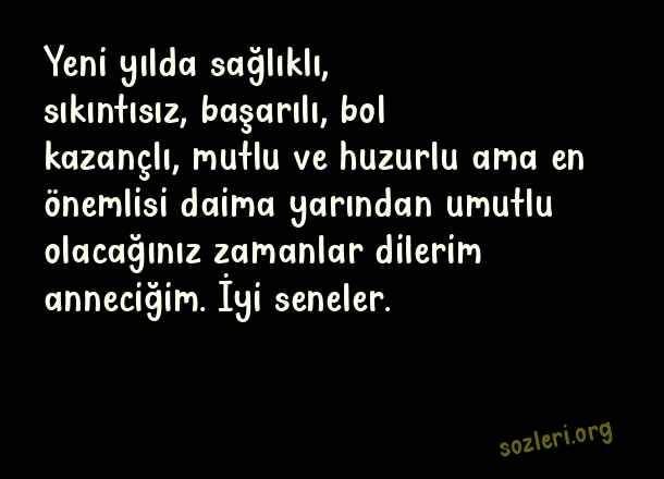 Yeni yılda sağlıklı, sıkıntısız, başarılı, bol kazançlı, mutlu ve huzurlu ama en önemlisi daima yarından umutlu olacağınız zamanlar dilerim anneciğim. İyi seneler. ( Anneye Yeni Yıl )