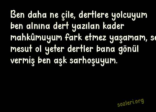Ben daha ne çile, dertlere yolcuyum ben alnına dert yazılan kader mahkûmuyum fark etmez yaşamam, sen mesut ol yeter dertler bana gönül vermiş ben aşk sarhoşuyum. ( Arabesk Aşk )