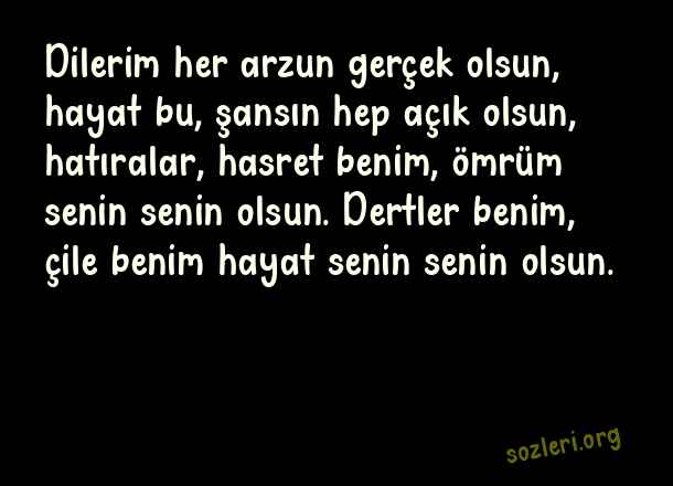Dilerim her arzun gerçek olsun, hayat bu, şansın hep açık olsun, hatıralar, hasret benim, ömrüm senin senin olsun. Dertler benim, çile benim hayat senin senin olsun. ( Arabesk Aşk )