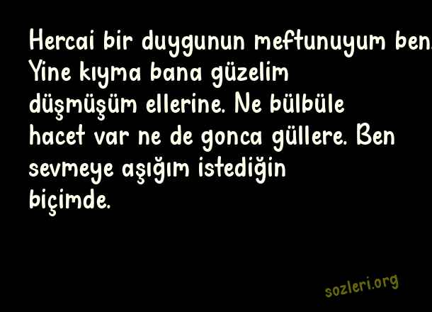 Hercai bir duygunun meftunuyum ben. Yine kıyma bana güzelim düşmüşüm ellerine. Ne bülbüle hacet var ne de gonca güllere. Ben sevmeye aşığım istediğin biçimde. ( Arabesk Aşk )