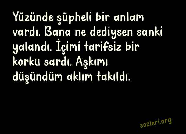 Yüzünde şüpheli bir anlam vardı. Bana ne dediysen sanki yalandı. İçimi tarifsiz bir korku sardı. Aşkımı düşündüm aklım takıldı. ( Arabesk Aşk )