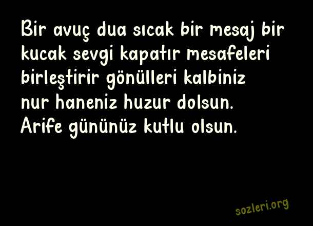 Bir avuç dua sıcak bir mesaj bir kucak sevgi kapatır mesafeleri birleştirir gönülleri kalbiniz nur haneniz huzur dolsun. Arife gününüz kutlu olsun. ( Arife Günü )
