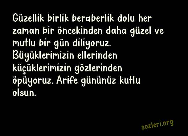 Güzellik birlik beraberlik dolu her zaman bir öncekinden daha güzel ve mutlu bir gün diliyoruz. Büyüklerimizin ellerinden küçüklerimizin gözlerinden öpüyoruz. Arife gününüz kutlu olsun. ( Arife Günü )