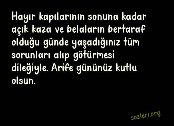Hayır kapılarının sonuna kadar açık kaza ve belaların bertaraf olduğu günde yaşadığınız tüm sorunları alıp götürmesi dileğiyle. Arife gününüz kutlu olsun. ( Arife Günü )