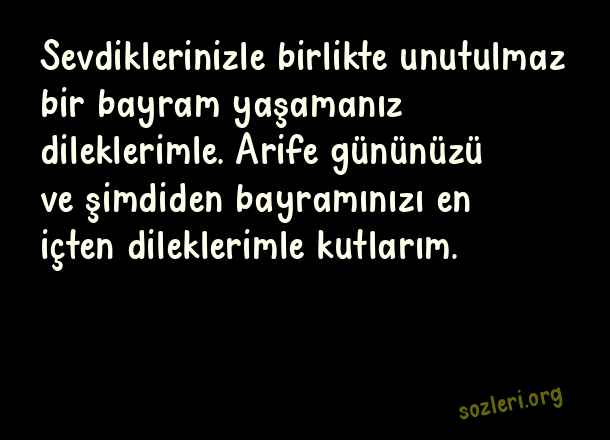 Sevdiklerinizle birlikte unutulmaz bir bayram yaşamanız dileklerimle. Arife gününüzü ve şimdiden bayramınızı en içten dileklerimle kutlarım. ( Arife Günü )