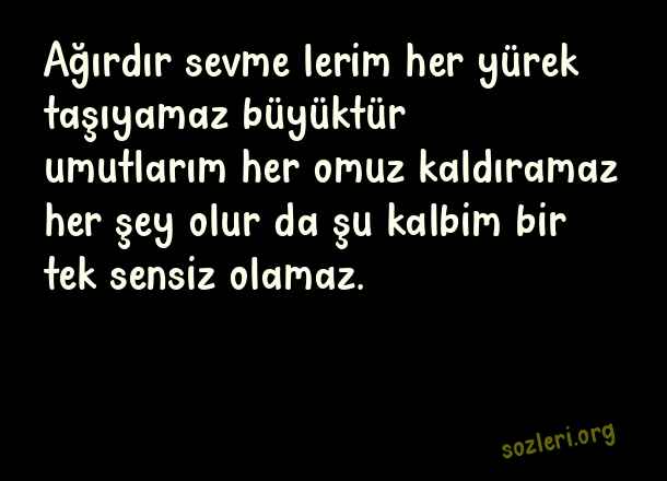 Ağırdır sevme lerim her yürek taşıyamaz büyüktür umutlarım her omuz kaldıramaz her şey olur da şu kalbim bir tek sensiz olamaz. ( Sevgiliye Aşk Dolu Sözler )