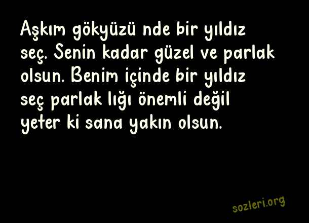 Aşkım gökyüzü nde bir yıldız seç. Senin kadar güzel ve parlak olsun. Benim içinde bir yıldız seç parlak lığı önemli değil yeter ki sana yakın olsun. ( Sevgiliye Aşk Dolu Sözler )