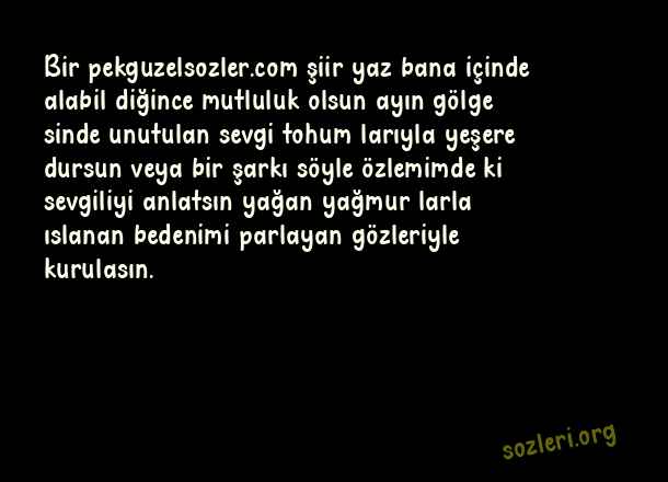 Bir şiir yaz bana içinde alabil diğince mutluluk olsun ayın gölge sinde unutulan sevgi tohum larıyla yeşere dursun veya bir şarkı söyle özlemimde ki sevgiliyi anlatsın yağan yağmur larla ıslanan bedenimi parlayan gözleriyle kurulasın. ( Sevgiliye Aşk Dolu Sözler )