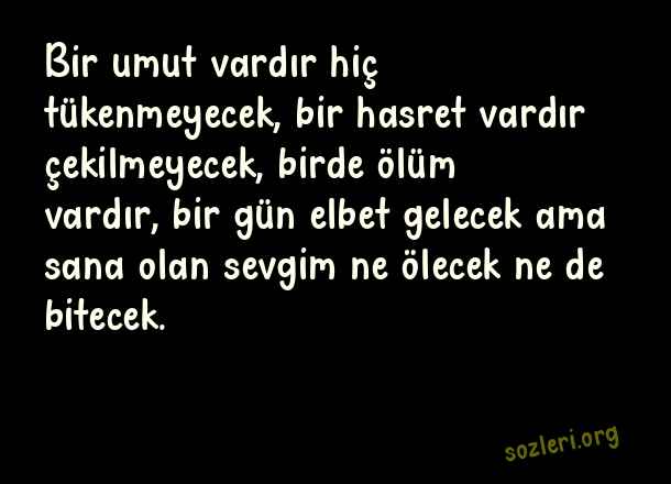 Bir umut vardır hiç tükenmeyecek, bir hasret vardır çekilmeyecek, birde ölüm vardır, bir gün elbet gelecek ama sana olan sevgim ne ölecek ne de bitecek. ( En Güzel Aşk Dolu Sözler 2023 )
