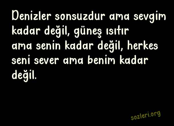 Denizler sonsuzdur ama sevgim kadar değil, güneş ısıtır ama senin kadar değil, herkes seni sever ama benim kadar değil. ( En Güzel Aşk Dolu Sözler 2023 )