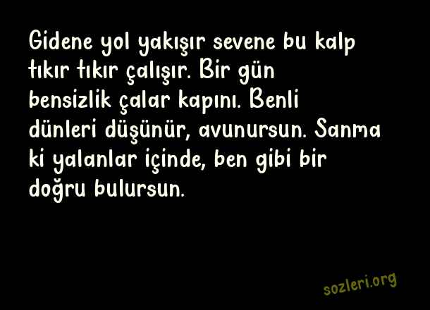 Gidene yol yakışır sevene bu kalp tıkır tıkır çalışır. Bir gün bensizlik çalar kapını. Benli dünleri düşünür, avunursun. Sanma ki yalanlar içinde, ben gibi bir doğru bulursun. ( En Güzel Aşk Dolu Sözler 2023 )