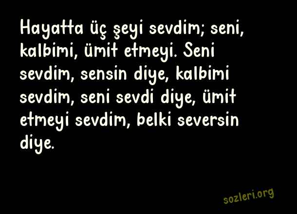 Hayatta üç şeyi sevdim; seni, kalbimi, ümit etmeyi. Seni sevdim, sensin diye, kalbimi sevdim, seni sevdi diye, ümit etmeyi sevdim, belki seversin diye. ( En Güzel Aşk Dolu Sözler 2023 )