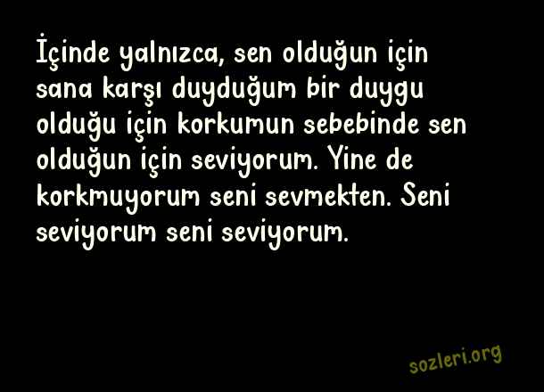 İçinde yalnızca, sen olduğun için sana karşı duyduğum bir duygu olduğu için korkumun sebebinde sen olduğun için seviyorum. Yine de korkmuyorum seni sevmekten. Seni seviyorum seni seviyorum. ( En Güzel Aşk Dolu Sözler 2023 )