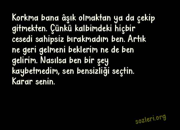 Korkma bana âşık olmaktan ya da çekip gitmekten. Çünkü kalbimdeki hiçbir cesedi sahipsiz bırakmadım ben. Artık ne geri gelmeni beklerim ne de ben gelirim. Nasılsa ben bir şey kaybetmedim, sen bensizliği seçtin. Karar senin. ( En Güzel Aşk Dolu Sözler 2023 )