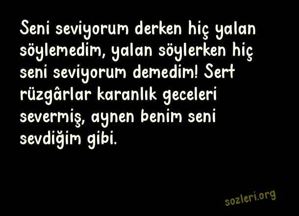 Seni seviyorum derken hiç yalan söylemedim, yalan söylerken hiç seni seviyorum demedim! Sert rüzgârlar karanlık geceleri severmiş, aynen benim seni sevdiğim gibi. ( En Güzel Aşk Dolu Sözler 2023 )