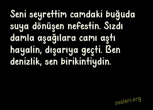 Seni seyrettim camdaki buğuda suya dönüşen nefestin. Sızdı damla aşağılara camı aştı hayalin, dışarıya geçti. Ben denizlik, sen birikintiydin. ( En Güzel Aşk Dolu Sözler 2023 )