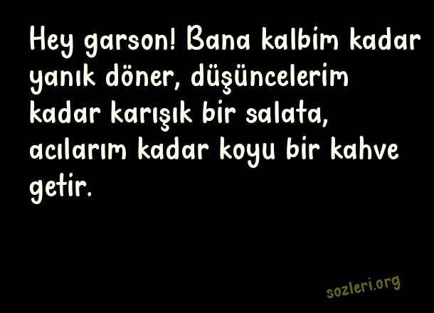 Hey garson! Bana kalbim kadar yanık döner, düşüncelerim kadar karışık bir salata, acılarım kadar koyu bir kahve getir. ( Aşk Espirileri )
