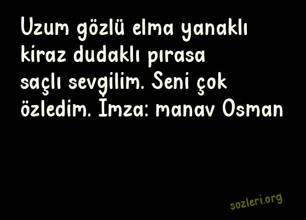 Uzum gözlü elma yanaklı kiraz dudaklı pırasa saçlı sevgilim. Seni çok özledim. İmza: manav Osman ( Aşk Espirileri )